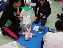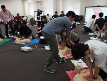 成人及び小児・乳児の心肺停止に対する初期対応を身につけるための一日コースで、AED(自動体外式除細動器)を用いた心肺蘇生法(CPR)や窒息の解除方法なども学びました。